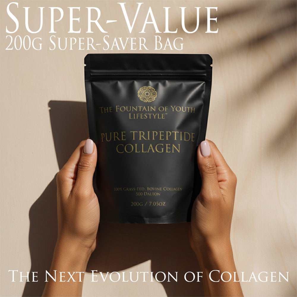 Elevate your routine with 30 daily sachets of The Fountain of Youth Tripeptide Collagen.